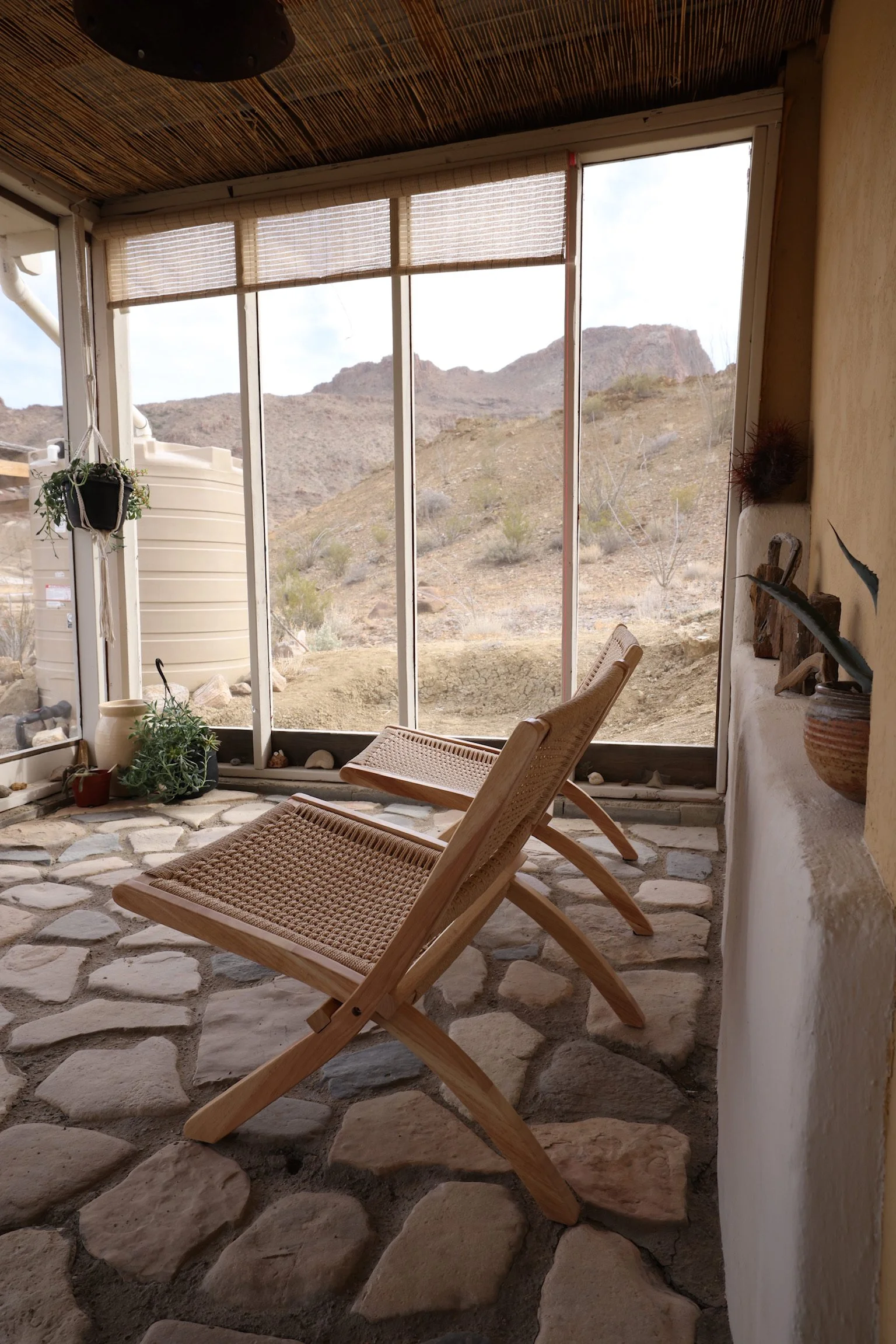 Tucked into the Chihuahuan desert, Big Bend Homestead rests among the ocotillo and creosote. A warm two room homestead with outstanding views awaits you. BBH boasts a large screened-in porch, full kitchen, cozy living room with a handcrafted couch that doubles as additional sleeping quarters for one adult or two children, and a large bedroom with queen bed and artists desk.
