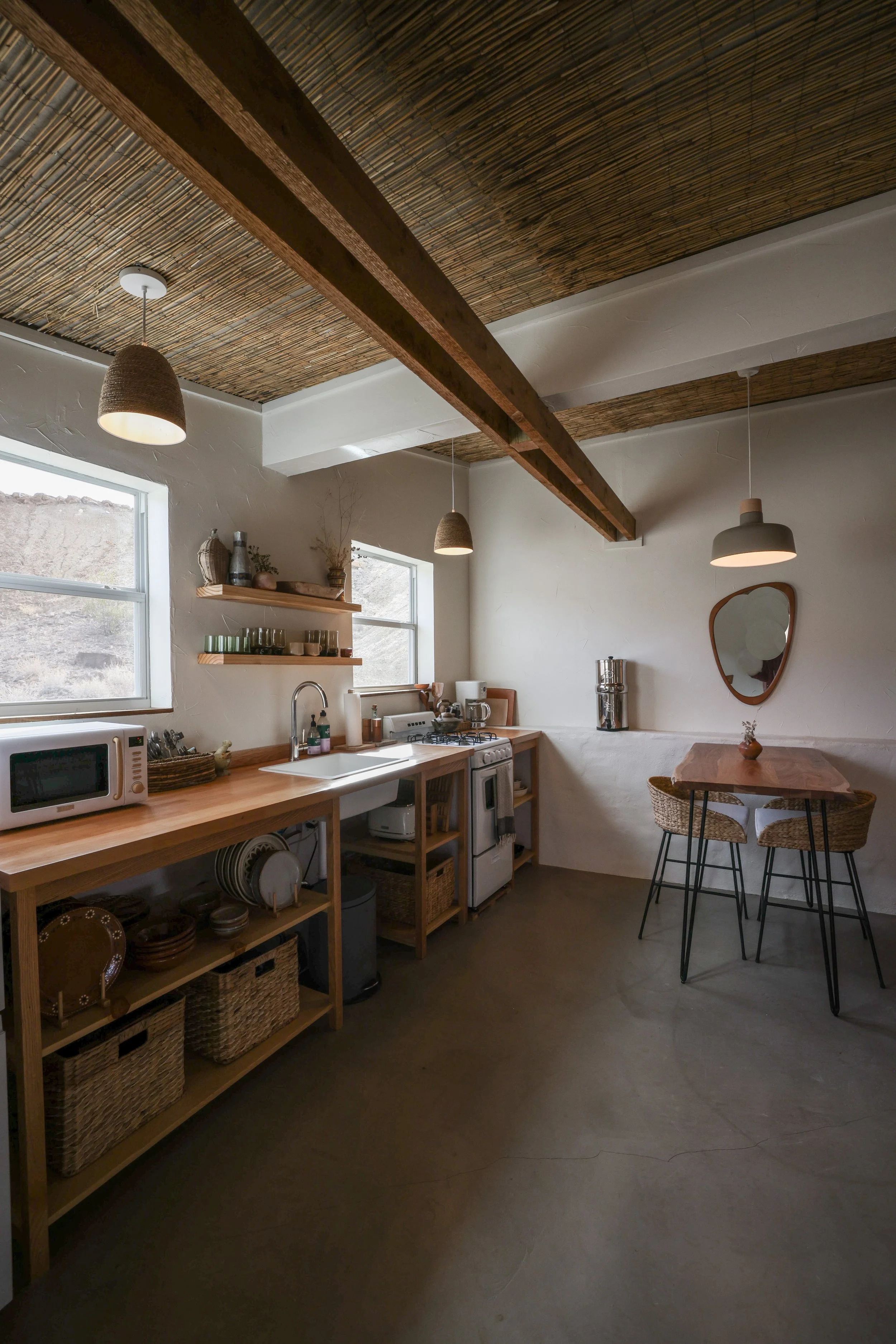 Our kitchen features a full size refrigerator, gas range, full sink operating off rainwater catchment, butcher block countertops and small dining area. Enjoy cutting boards from Material, Haden coffee maker and toaster, and handmade ceramic dishes.